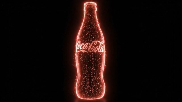 Вдруг сверху начинает литься янтарная Coca-Cola, заполняя контур бутылки снизу вверх. Волна шипения постепенно рассеивается, и на её месте возникает полностью реализованная стеклянная бутылка Coca-Cola, холодная, с каплями конденсата. У основания собирается лёгкий туман, подчёркивая свежесть напитка.