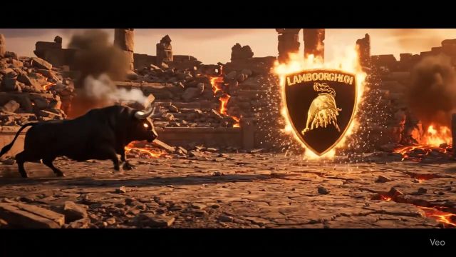 “action”: “The bull storms across the arena, each hoofstep cracks the stone. A glowing golden Lamborghini logo levitates ahead, surrounded by sparks. The bull charges and leaps through the emblem. Mid-air, fire engulfs him and he transforms into a blazing gold Lamborghini Revuelto. The car lands and accelerates toward the camera with smoke trails and scorched dust flying.”,