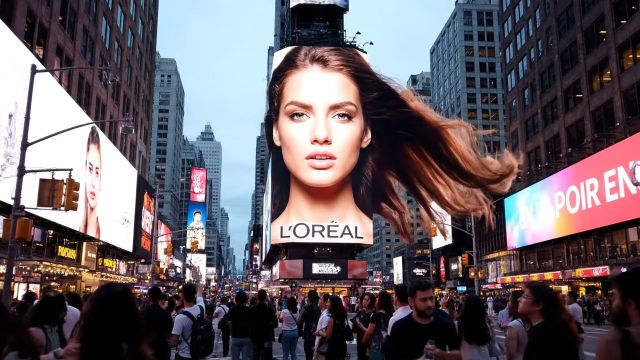 Камера медленно приближается к билборду, фиксируя лёгкое движение волос и блеск глаз женщины на экране. В финале акцент смещается на элегантный логотип L’Oréal, плавно вспыхивающий на поверхности билборда, подчёркивая идею красоты, которая выходит за рамки воображаемого.