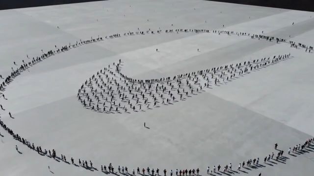 Видео начинается с высоко расположенного дрона, который показывает огромную однотонную серую площадку сверху. Камера статична, слегка поднимается, создавая ощущение масштаба. По периметру стоят сотни крошечных фигурок людей, видимых как миниатюрные человечки, но ясно узнаваемые как люди.