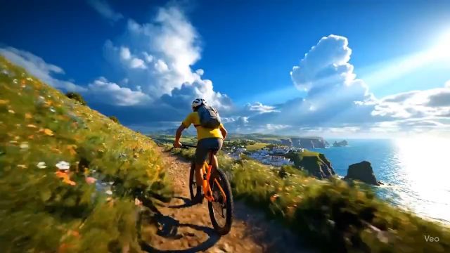 “An 8-second, hyper-realistic 3D animated shot, inspired by a vibrant anime aesthetic, following a mountain biker along a breathtaking coastal cliff path with a dramatic, sweeping sky.”, “duration_seconds”: 8, “prompt_details”: { “subject”: { “biker”: { “appearance”: “An athletic young adult wearing a simple t-shirt, shorts, and a helmet. They have a small, practical backpack for supplies.”, “action”: “Cycling at a controlled, confident pace along the narrow dirt trail. Their body shifts and leans naturally with the bike as they navigate the terrain. Small pebbles and dust are kicked up by the tires.” } }, “environment”: { “setting”: “A high, sunlit mountain ridge overlooking a stunning coastline, evoking the feel of a fantasy world or an idealized version of the Mediterranean coast.”, “trail”: “A narrow, winding dirt and rock path carved into the side of a steep, grassy cliff. Patches of wildflowers and small shrubs dot the landscape.”, “vista”: “In the distance below, a picturesque coastal town with white-washed walls and terracotta roofs sprawls out, meeting the edge of a sparkling, turquoise ocean.”, “sky”: “The dominant feature. A vast, deep blue sky filled with immense, beautifully rendered volumetric clouds. The clouds have a dynamic, sweeping motion, as if shaped by strong winds, creating a powerful sense of scale and wonder.” }, “objects”: { “mountain_bike”: { “model”: “A modern cross-country or trail bike with a vibrant orange frame that stands out against the green and blue background.”, “details”: “Hyper-realistic details are crucial: the suspension subtly compresses over bumps, the chain and gears are visible, and the tire treads leave clear tracks in the dirt.” } }, “camera_and_lighting”: { “shot_type”: “A sweeping, cinematic crane or drone shot. It starts by following the biker from behind and then gracefully pulls away and upwards, revealing the full, epic scale of the landscape and the sky.”, “camera”: “Shot with a wide-angle lens on a virtual 8K cinematic camera to capture the immense scope of the view. The motion is smooth and majestic.”, “lighting”: { “source”: “Bright, clear, late-morning sunlight. The lighting is warm and highly saturated, making the colors of the landscape pop.”, “effect”: “Strong directional light creates defined shadows. Shafts of light (‘God rays’) could be seen breaking through the clouds in the distance, adding to the dramatic and beautiful atmosphere.”, “atmosphere”: “Epic, adventurous, and filled with a sense of freedom and awe.” }, “focus”: “A deep depth of field is used to keep both the foreground (biker and trail) and the vast background (town, ocean, sky) in sharp, stunning focus.”, “color_palette”: “A highly vibrant and saturated palette. Dominated by the deep azure of the sky, the lush emerald of the cliffs, the turquoise of the ocean, and the bright orange of the bike.” }, “style”: { “aesthetic”: “A unique blend of photorealism with the compositional grandeur and vibrant color theory of high-end anime (e.g., Makoto Shinkai, Studio Ghibli). The final output should be a 3D render that feels both incredibly real and artistically stylized.”, “rendering_engine”: “Unreal Engine 5, leveraging Nanite for the detailed terrain and Lumen for real-time global illumination and reflections. Advanced volumetric cloud systems would be essential for the sky.” } } }