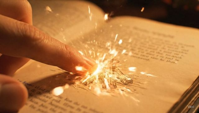 “description”: “An ultra-photorealistic, 8K cinematic macro video, showcasing a magical creation from a single touch. The scene opens on the aged page of an old wilderness survival guide, lit warmly and intimately as if inside a cozy study. On the parchment, a delicate hand-drawn ink sketch shows a small pile of sticks arranged for a campfire. A human finger gently enters the frame and touches the center of the illustration. At the point of contact, a brilliant orange spark flickers to life. The spark races along the ink lines, which begin to glow, smolder, and crackle as if alive. In a seamless, fluid transformation, the 2D ink lines slowly lift off the page, shimmering between flat illustration and three-dimensional form. The strokes thicken, darken, and then solidify into realistic textures—blackened wood grain, splintered bark, and glowing embers—emerging naturally from the drawing. The transition feels organic, as if the page itself is birthing the scene. Suddenly, fully-formed wooden logs materialize, and flames burst forth with vivid realism. They dance, flicker, and crackle while casting soft, dynamic shadows across the book’s text and the observer’s finger. The paper just beneath the campfire browns and curls gently from the heat, adding tactile detail. In the final moment, a miniature, living campfire rests upon the page, glowing warmly, sending up tiny embers that drift skyward, while a delicate wisp of smoke rises. The entire sequence feels magical, fluid, cozy, and full of wonder, with the 2D-to-3D transition unfolding smoothly and continuously, as though the illustration naturally evolves into reality.”, “style”: “Cinematic ultra-photorealism, 8K macro detail, magical realism, warm lighting, seamless 2D-to-3D transformation, fluid visual continuity, cozy atmosphere”