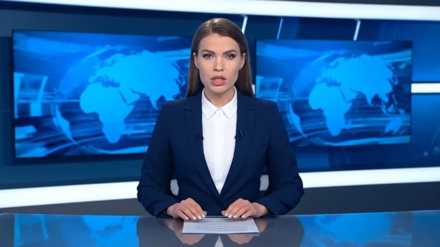 “environment”: “Modern TV news studio with sleek desks, large LED screens in the background displaying graphics, and subtle studio lighting.”,