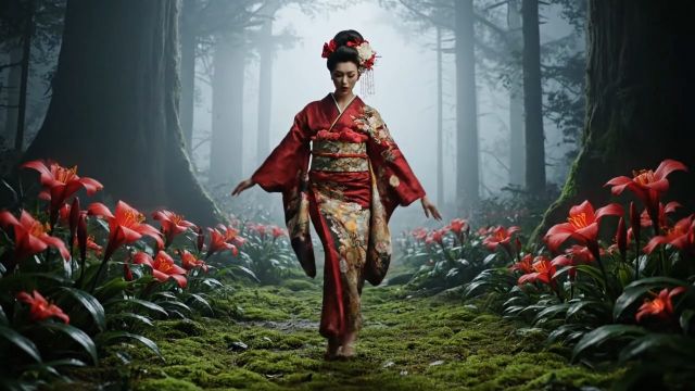 Съёмка детализированная и фотореалистичная: каждая складка кимоно, отблеск света на коже, мельчайшие детали волос и цветов переданы максимально натурально. Атмосфера видео — этирическая, магическая, с драматическим контрастом и объёмным освещением, создающая ощущение присутствия в сказочном лесу.