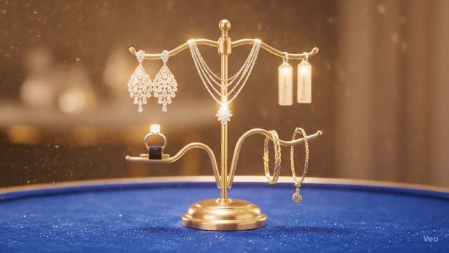 На видео показана небольшая элегантная шкатулка для ювелирных изделий с надписью «ShineMuse», стоящая на столешнице из бархата или мрамора под мягким прожекторным светом. Шкатулка слегка вибрирует, после чего рассыпается на мерцающую золотую пыль и искристые частицы, которые плавно поднимаются в воздух, медленно кружась и оседая. По мере оседания блеска перед зрителем появляется роскошная подставка для ювелирных изделий, и на ней поочередно материализуются украшения: сначала пара выразительных серёг, затем многоярусное ожерелье, сверкающее кольцо, изящные браслеты и тонкий браслет на щиколотку. Каждое украшение появляется с лёгким мерцанием, отражая мягкий свет, создавая ощущение магического сияния. Вся сцена выглядит мечтательно, женственно, с высокой детализацией, акцентируя внимание на текстуре металла и камней. Название бренда аккуратно видно на бирках или элементах подставки, добавляя брендовый акцент к визуальной композиции. Звуковая дорожка тихая, почти атмосферная, подчёркивает изысканность и волшебство происходящего. Камера плавно облетает подставку, показывая украшения с разных ракурсов, фиксируя их блеск и текстуру, затем задерживается на завершённой композиции, где все элементы расположены идеально, создавая гармоничную и визуально насыщенную сцену.