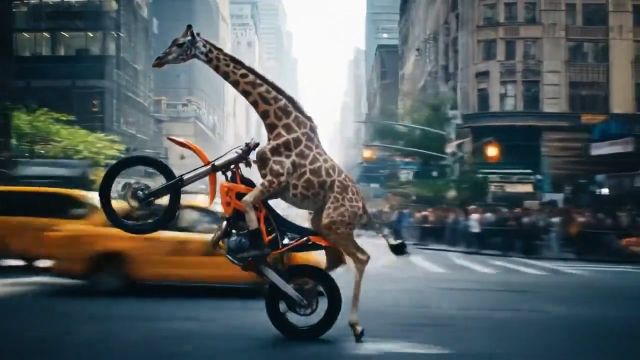 Видео начинается на шумной улице Нью-Йорка, где небоскрёбы тянутся к небу, желтые такси едут по дорогам, а светофоры мерцают. В центре сцены появляется жираф на грязевом байке. Его длинная шея и стройное тело создают комичный и одновременно впечатляющий образ, когда он резко поднимает переднее колесо в колесо-вверх и мчится по улице.