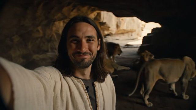 A cinematic handheld selfie-style video shot, showing a young man in ancient Middle Eastern robes with shoulder-length dark hair and a short beard, holding the camera like a selfie cam. He’s inside a dimly lit stone den with rugged cave walls. Behind him, several large lions slowly pace or rest, casting shadows in the flickering torchlight. The man speaks directly into the camera he holds, slightly amused expression as he whispers.
