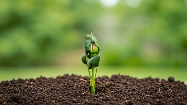 Видео начинается с неподвижного кадра земли — тёмный, богатый грунт занимает нижнюю часть экрана, фон мягко размытый в спокойных зелёных тонах. Камера статична, без приближений и движений, будто мы смотрим в маленький участок сада через объектив, зафиксированный на штативе.