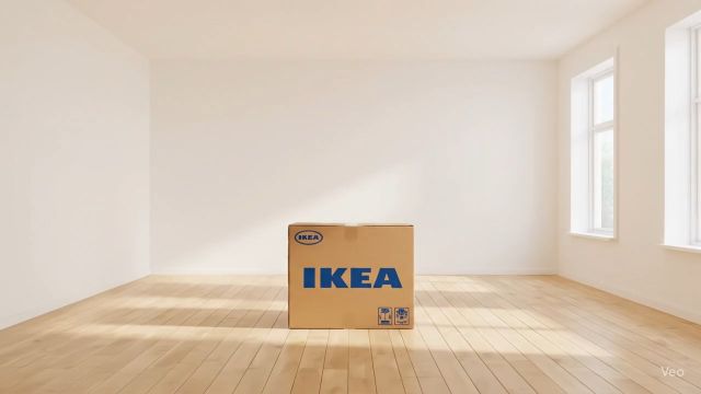 Видео начинается с широкого фиксированного кадра пустой скандинавской комнаты с белыми стенами и светлым деревянным полом. В центре комнаты стоит запечатанная коробка IKEA с хорошо видимым логотипом. Освещение солнечное и мягкое, подчёркивающее чистоту и минимализм интерьера.