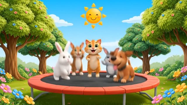 “description”: “A lively cartoon-style video featuring a sunny park filled with cheerful animals. Rabbits, cats, and dogs bounce energetically on a large trampoline, performing playful flips and somersaults in mid-air. Each jump is accompanied by exaggerated cartoon physics and joyful expressions, with animals laughing and tails wagging. Around them, bright animated trees sway lightly in the breeze, and colorful flowers bloom and bounce slightly as the animals land.”,
